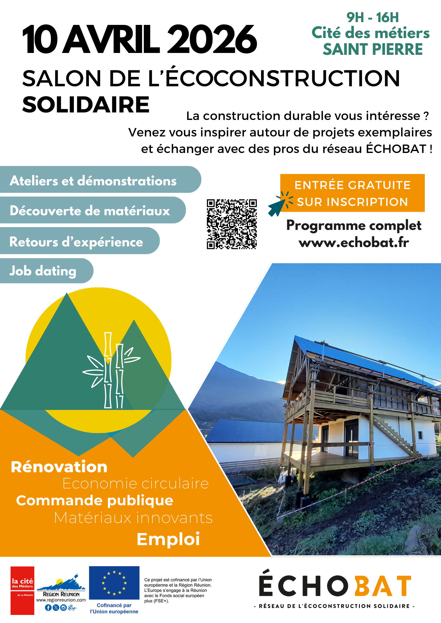 A vos agendas ! Le 10 avril 2026, ÉCHOBAT La Réunion organise avec ses adhérents professionnels du secteur le Salon de l’écoconstruction solidaire à la Cité des Métiers de Saint-Pierre, un événement inédit dédié à la transition écologique et sociale du secteur du bâtiment sur le territoire réunionnais.