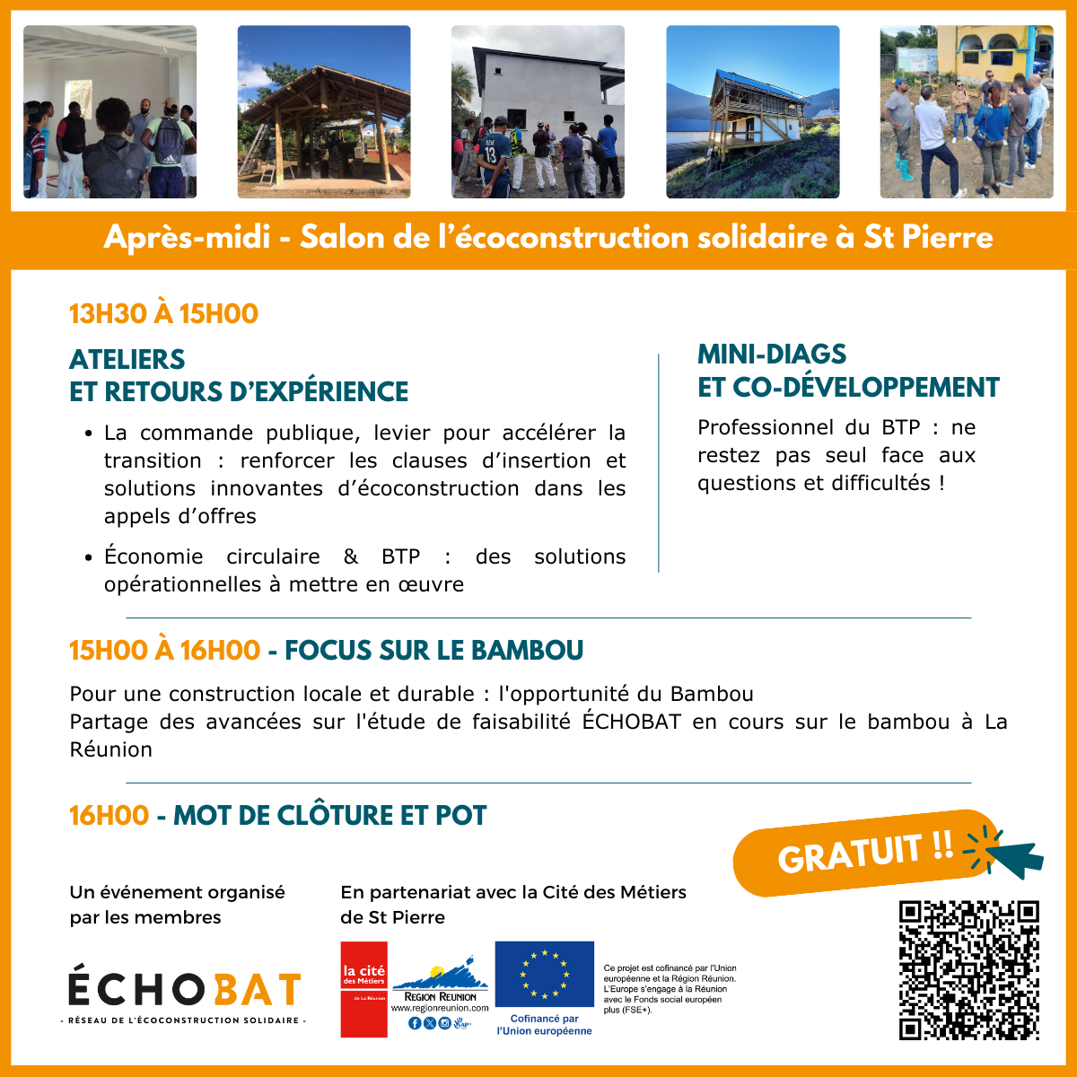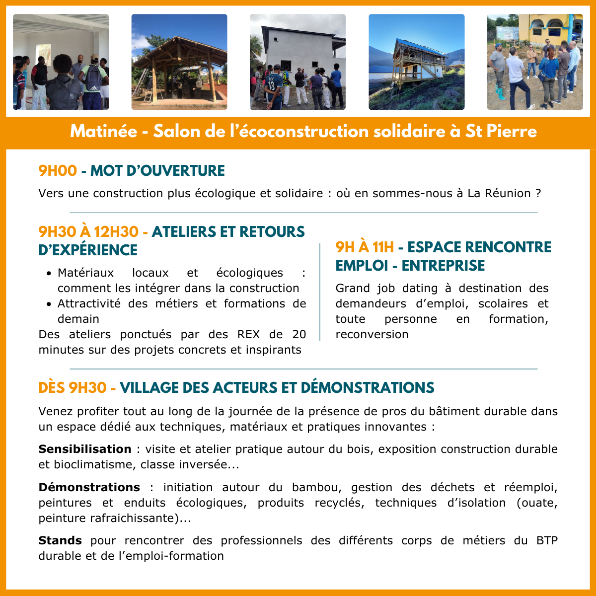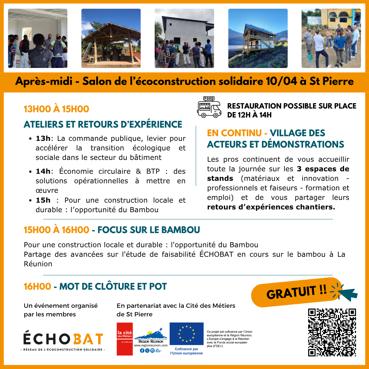Tout au long de la journée, les échanges se feront concrets et ancrés dans le réel. Au programme : ateliers participatifs, démonstrations de matériaux locaux et biosourcés, retours d’expériences de terrain, et en fil rouge un espace job dating pour valoriser les métiers du bâtiment durable et créer des passerelles vers l’emploi, l’insertion et la formation. Le salon mettra en avant les savoir-faire réunionnais, les solutions adaptées au climat tropical, le réemploi et les parcours d’insertion professionnelle, à travers celles et ceux qui les mettent en œuvre au quotidien.