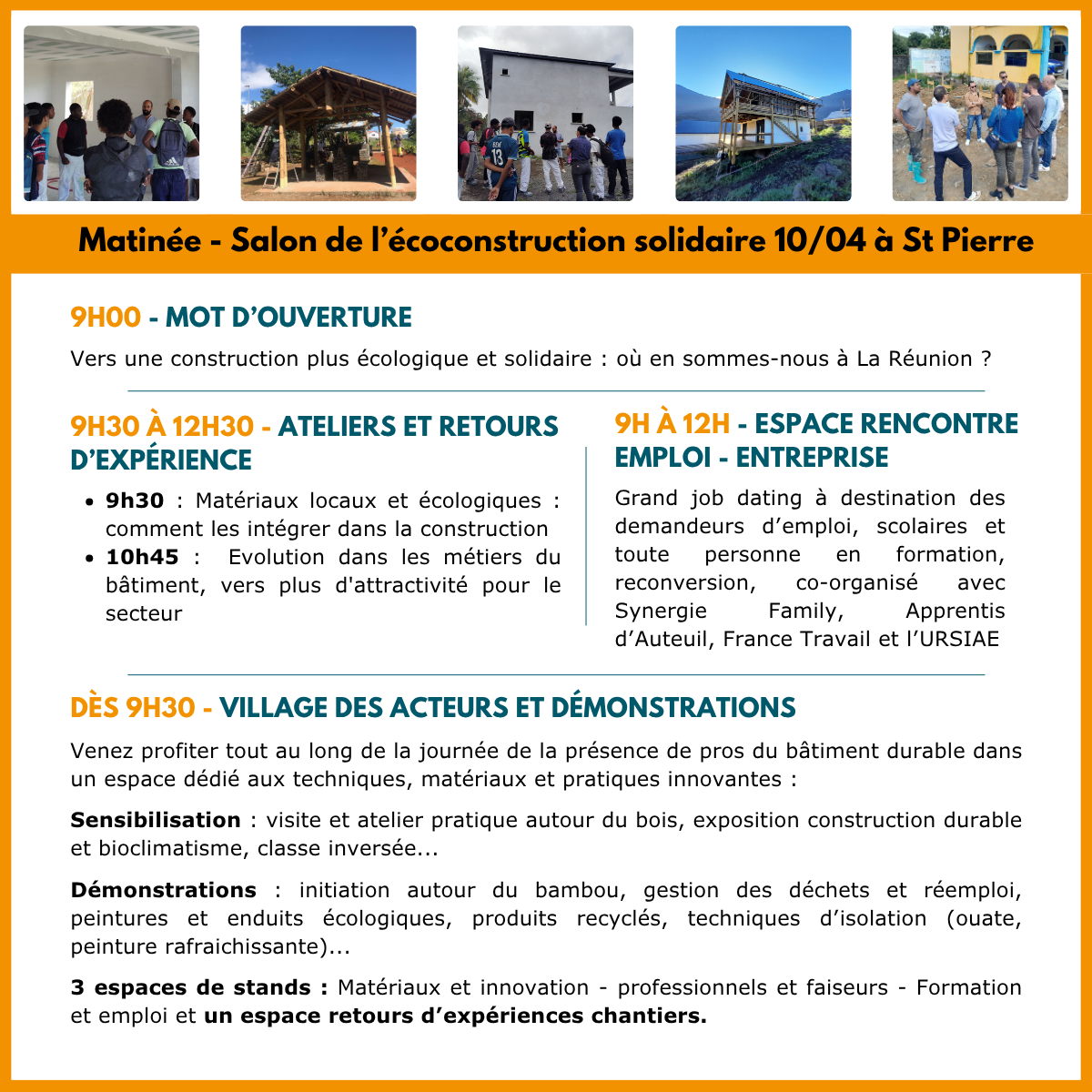 Le salon de l'écoconstruction solidaire se tiendra le 10 avril 2026 à Saint-Pierre, de 9h à 16h. Cet événement, organisé en partenariat avec La Cité des Métiers de Saint-Pierre, rassemblera professionnels du bâtiment, acteurs de l’ESS, collectivités, organismes de formation et grand public autour des enjeux de la transition écologique et sociale du secteur de la construction à La Réunion.
