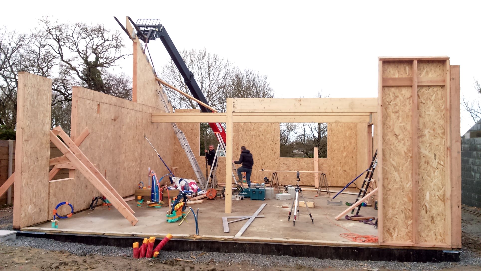 Ossature Bois en auto-construction accompagnée, phytoépuration, chauffe-eau thermodynamique, VMC simple flux, brique de terre crue, poêle à granulés, bardage, récupération eau de pluie.